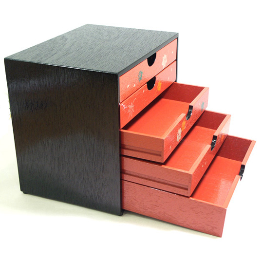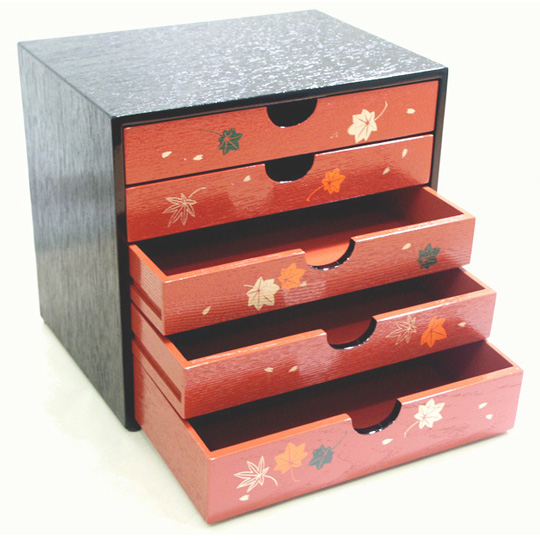 5つの引き出しは高さを変えているので使いやすく、桜と紅葉をあしらった春秋のデザインもかわいらしいと評判です。
