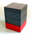 在庫限りのお買い得、木製漆塗りの小ぶりな三段重です。上塗りをかけずに在庫として残っていたものを、今回、2段を黒、1段を朱という珍しい組み合わせで、色違いに漆を塗り仕上げた、どこにもない限定商品です。