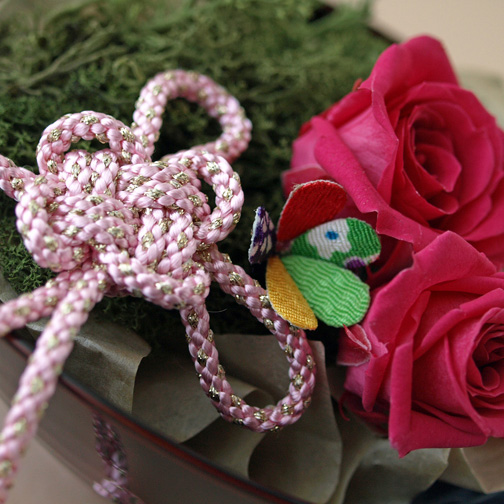 繁栄・幸運を意味する吉祥結びの組紐も一緒になって、食卓や玄関などに彩りを添える商品です。もちろん小鉢は、花を取り外してもお使い頂けます。