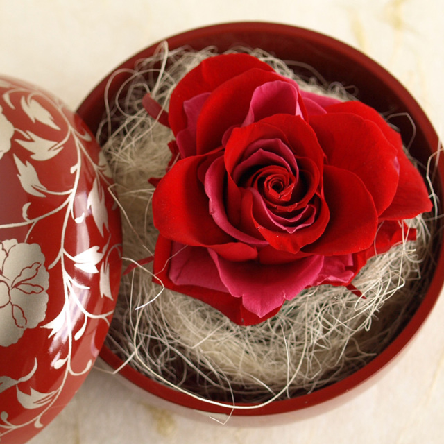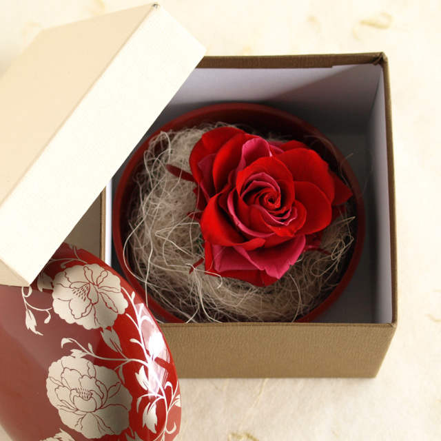 バラのプリザーブドフラワーを赤の漆の器にアレンジ。