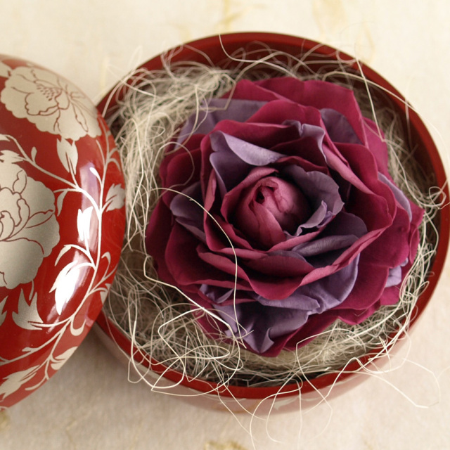 元々、砂糖菓子などを入れる漆塗りのボンボニエールに、一輪の大輪バラ メリアローズを組み合わせて、 その名の通り、お花のスウィーツといった印象です。