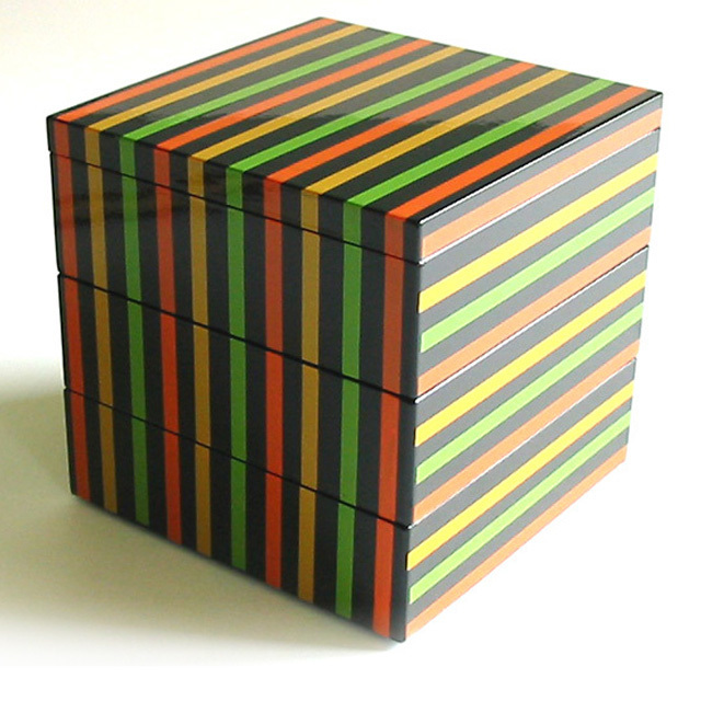 独楽柄の新しいデザインにチャレンジした、小さめの三段の重箱です。