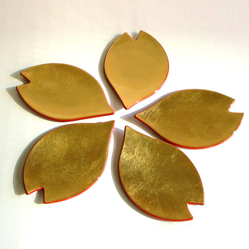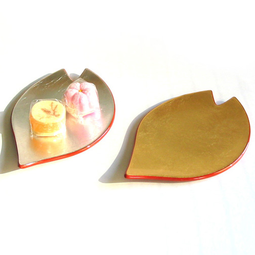 桜の花びらをモチーフにした銘々皿です。金箔や銀箔をあしらったデザインは、花びらの形と相まって非常に華やかな印象を与えてくれます。