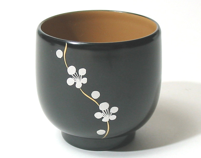 梅の絵がかわいらしい、漆塗りの夫婦の湯呑です。