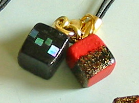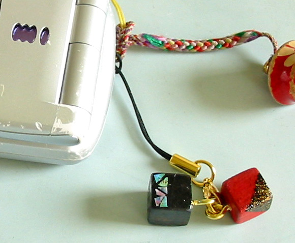 ひのきのキューブに、黒と朱の漆を塗り、その上から金箔を貼ったり、螺鈿を施したりして仕上げており、非常に手間がかかっています。それでも塗師屋さんが半分遊びで作ったようなストラップなので、お値段は破格に安く設定できました(この価格でいつまで販売できるか、正直わかりません)。